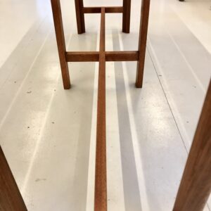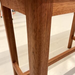 En lokal familie her fra Stevns kontaktede os med ønske om en bænk til deres badeværelse. Bænken skulle passe til deres øvrige inventar i rummet, som er holdt i brune og rødlige nuancer og stilles i en niche ved deres badekar. Vi foreslog den rødebrune sipomahogni. Bænken har et slankt udtryk, idet benene er afrundede og udført som vinkelben for øget stabilitet. Sædet er vælvet, så man ikke glider af.