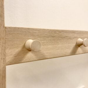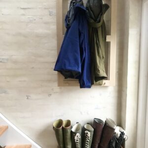 Pladsoptimering del lll: I det lille sommerhus på Røsnæs er der et elskab, der er i vejen. Derfor har vi fremstillet denne kombinerede garderobe og elskabsskjuler i sæbebehandlet egetræ. Rammen, som har en sprosse i midten, hænger på et såkaldt pariserophæng og er sikret med to messingskruer for oven. På dens vandrette dele er monteret 12 hånddrejede knager i avnbøg. For at komme ind i elskabet, skruer man blot de to messingskruer i toppen af.