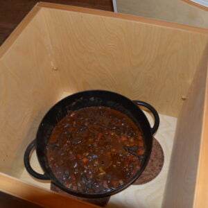 I høkassen er der en hylde som kan flyttes op og ned. Det er derfor muligt at have noget nederst der skal holdes varmt og noget andet ovenpå der lige skal blive færdigt.