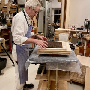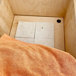 På de tre sidste billeder i billedrækken ses den første version af høkassen med synlige skruer og isolering med flamingo. Vores kunde er venlig at fortælle om og tage billeder af brugen af deres høkasse.