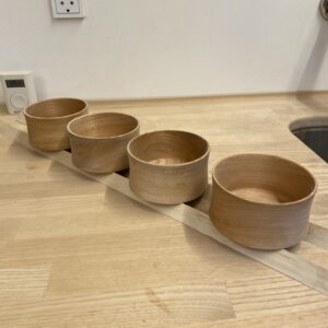 4 ens skåle af elmetræ er nu færdige fra drejebænken. De er drejet ud fra samme stykke træ, derfor det ensartede udtryk. Med deres elegante form og smukke årringe klæder de ethvert moderne interiør. Glæd dig over dem og brug dem til daglig. De kan bruges til madvarer da de er behandlet med en fødevareegnet olie. Vask af under vandhanen og tør efter med viskestykke eller papir. Bliver de lidt tørre at se på, så giv dem lidt af din madolie. Skålene sælges samlet eller enkeltvis. Skålene måler 5 cm i højden. Diameteren er 10,5 cm.
