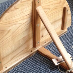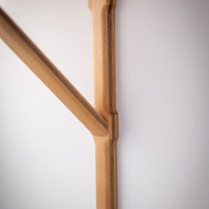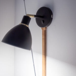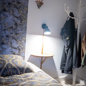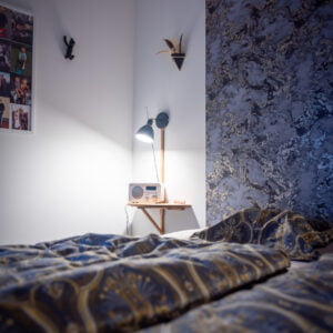Efter kundens ønske er de to sengeborde væghængte, hvilket helt klart letter rengøring på gulvet. Bordpladen er af dansk kirsebær med et mellemlæg af nøddetræ. For at undgå indfræsning i væg eller plastik kabelbakker har vi integreret kabelskjulere i udformning af sengebordene. De er også udført af kirsebær med nøddetræs indlæg.